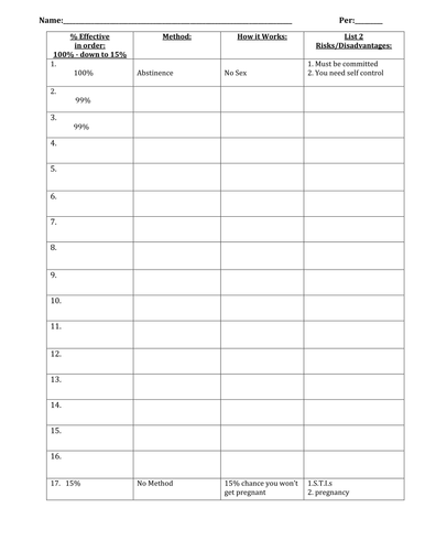 Birth Control Worksheet Key And Resource Handout