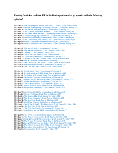 Us History All Episodes 1 47 Crash Course Youtube Video Guide Questions