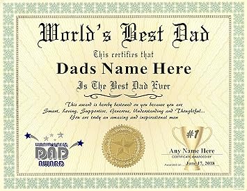 Worlds Best Dad Certificate Award Custom Printed By Us With Any Name Date 8 5 By 11 Inches Free Certificate Folder Fathers Day