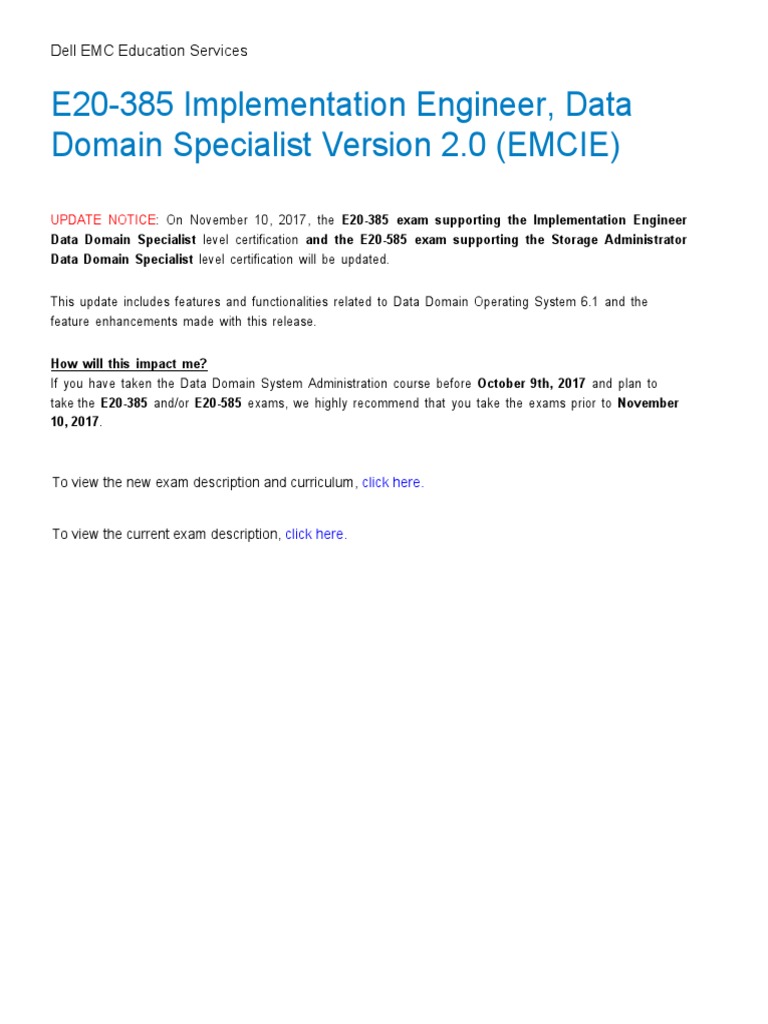 These sample questions will make you very familiar with both the type and the difficulty level of the questions on the e20 385 certification test. This curriculum is for partners specializing in data domain. This course consists of lectures and hands on learning about data domain system concepts managing network interfaces verifying system configuration performing data backups and recoveries configuring and managing a vtl managing data security planning for capacity. Examstrainer one of the leading and trusted name always offers updated dell emc data domain specialist practice exam questions and practice test software which gives you the assured to pass your exams in the first try.