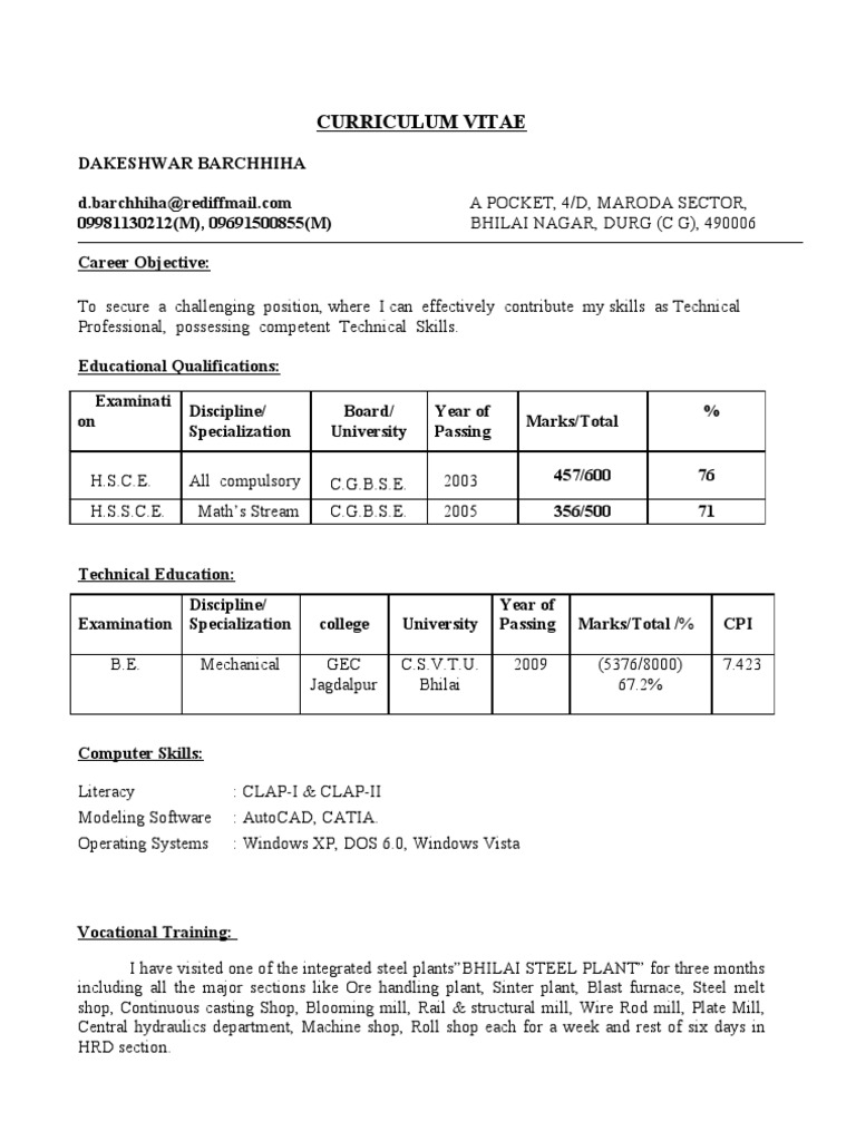 Fresher Mechanical Engineer Resume Steel Mill Technology