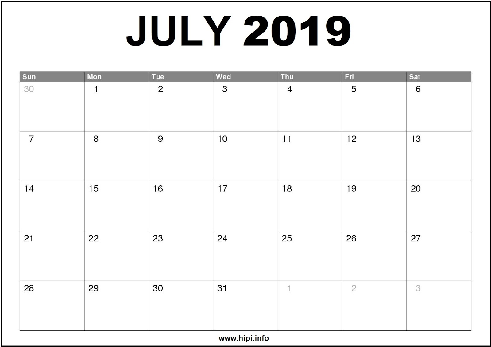 Free Blank July 2019 Printable Calendar
