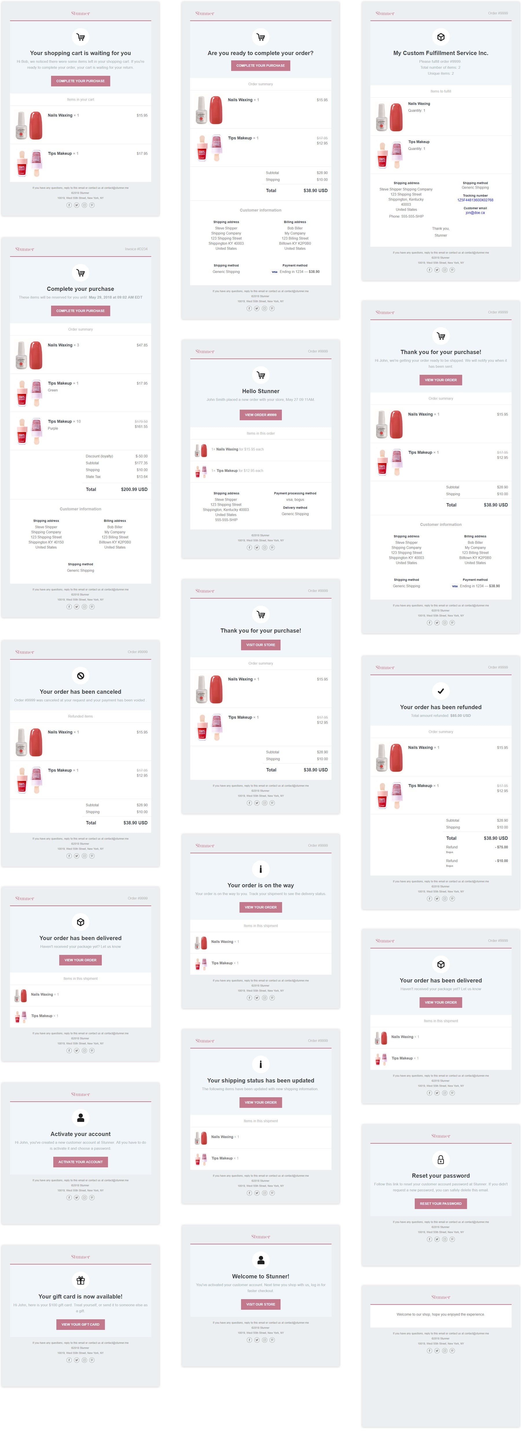 Your store comes with email templates that you can customize with your logo and brand accent coloryou can choose to have email notifications sent to you your staff or your customers depending on the setting for your order notifications. They are sent to you your staff or your customers depending on the event as well as your order notification settings. Each theme includes all 22 email notification templates supported by shopify. From the first drop down menu select the email address for the notification from the following options.