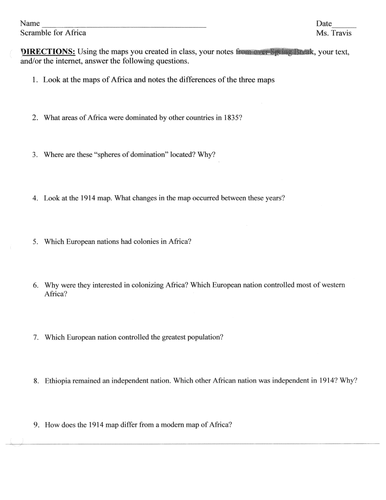 The Scramble For Africa Worksheet For 9th 10th Grade