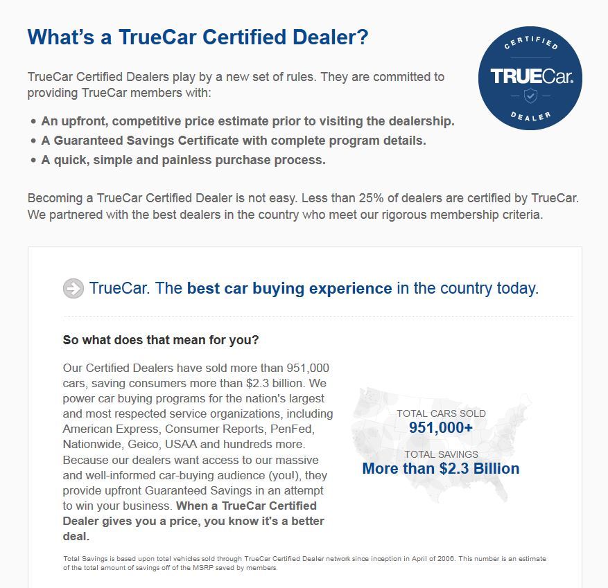 With truecar a certified dealer gives you an upfront personalized offer that includes all fees accessory costs and incentives. Truecar does not broker sell or lease motor vehicles. Truecar will then provide you with a price report which you can take to one of about 10000 participating truecar certified dealerships across the country thus eliminating the hassle of car buying. Truecar is a free online pricing tool for new and used cards that provides a truecar price quote based on local car sales data.