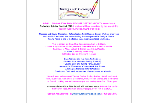 Tuning fork therapy is a form of sound therapy and is like laser energy surgerythe tuning fork is simply responding to the electro chemical cellular reactions that your body gives off and if there is a blockage the fork will clunk and if there is no blockage present the fork will sing its beautiful tone. We are also the developers of a series of sound healing tools that are used by health care practitioners around the world to promote health and well being. Enjoy this free online course to learn all the basics of using tuning forks. To receive the master tuning fork therapy practitioner certification you will need to successfully complete all levels of certifications offered and do 10 case studies.