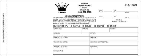 Agriculture Weighmaster Certificate 2047 California