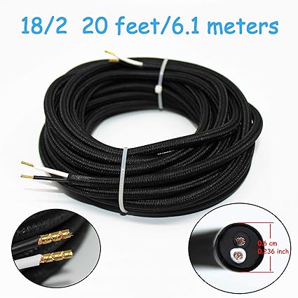 18 2 20ft Vintage Electrical Wire Lamp Cord Rayon Covered Braided Black 18 Awg 2 Conductor Flexible Fabric Pendant Lighting Power 10a